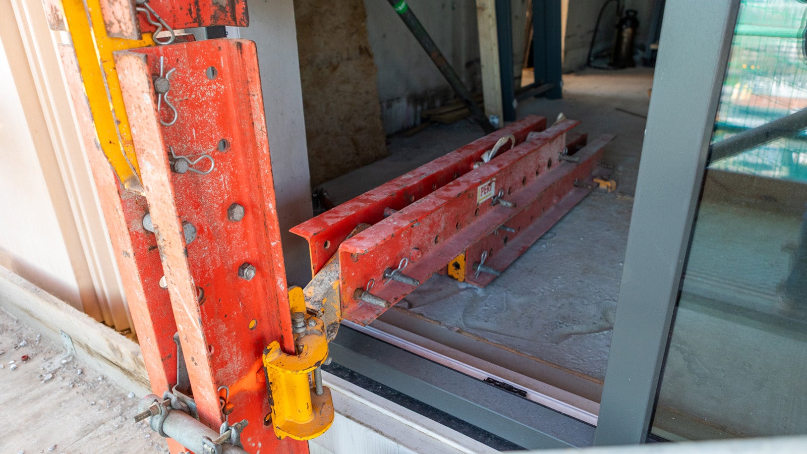 Via klimschoenen naar binnenDe klimsteigers hangen aan klimschoenen die door een tijdelijke opening zijn bevestigd op de vloer.