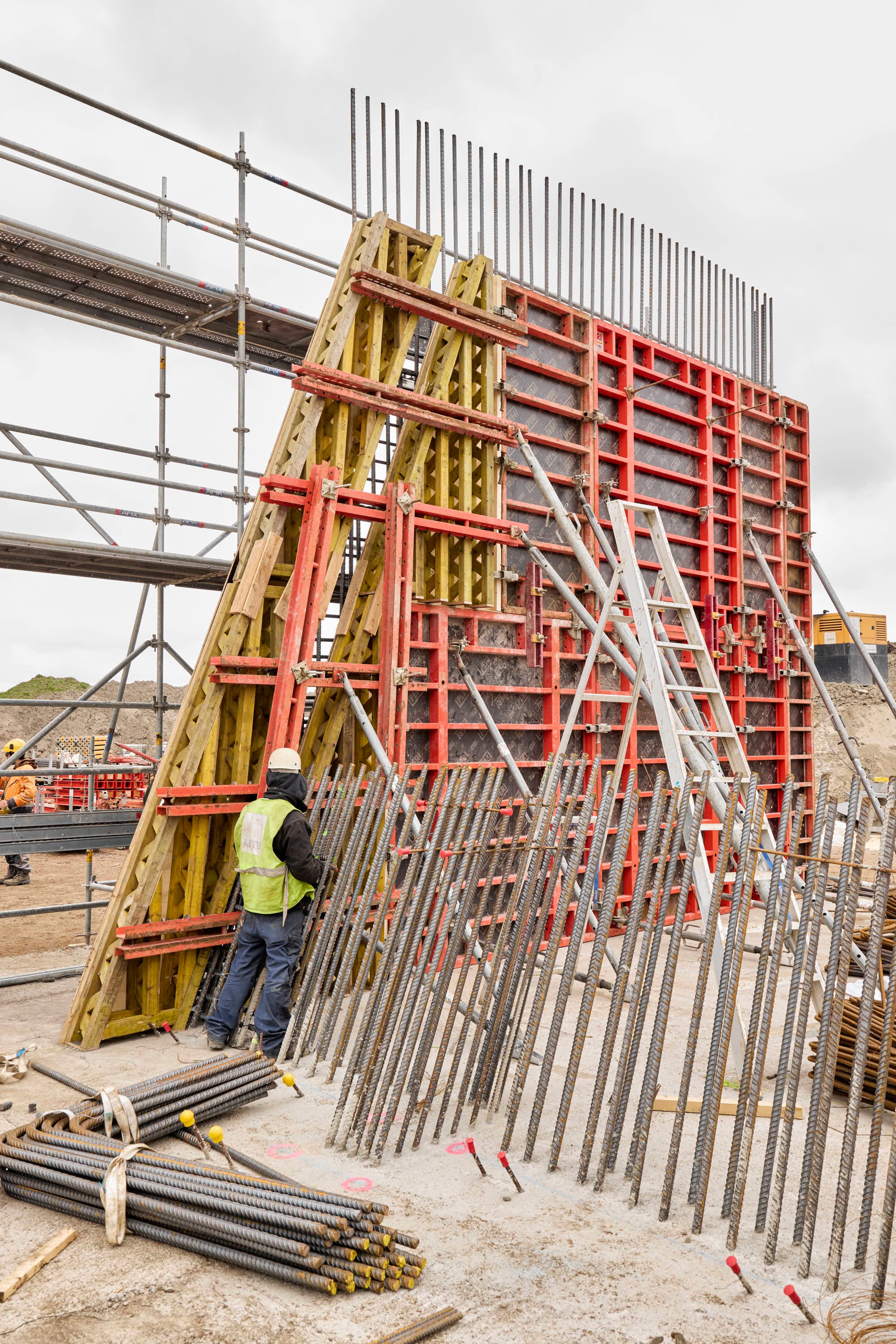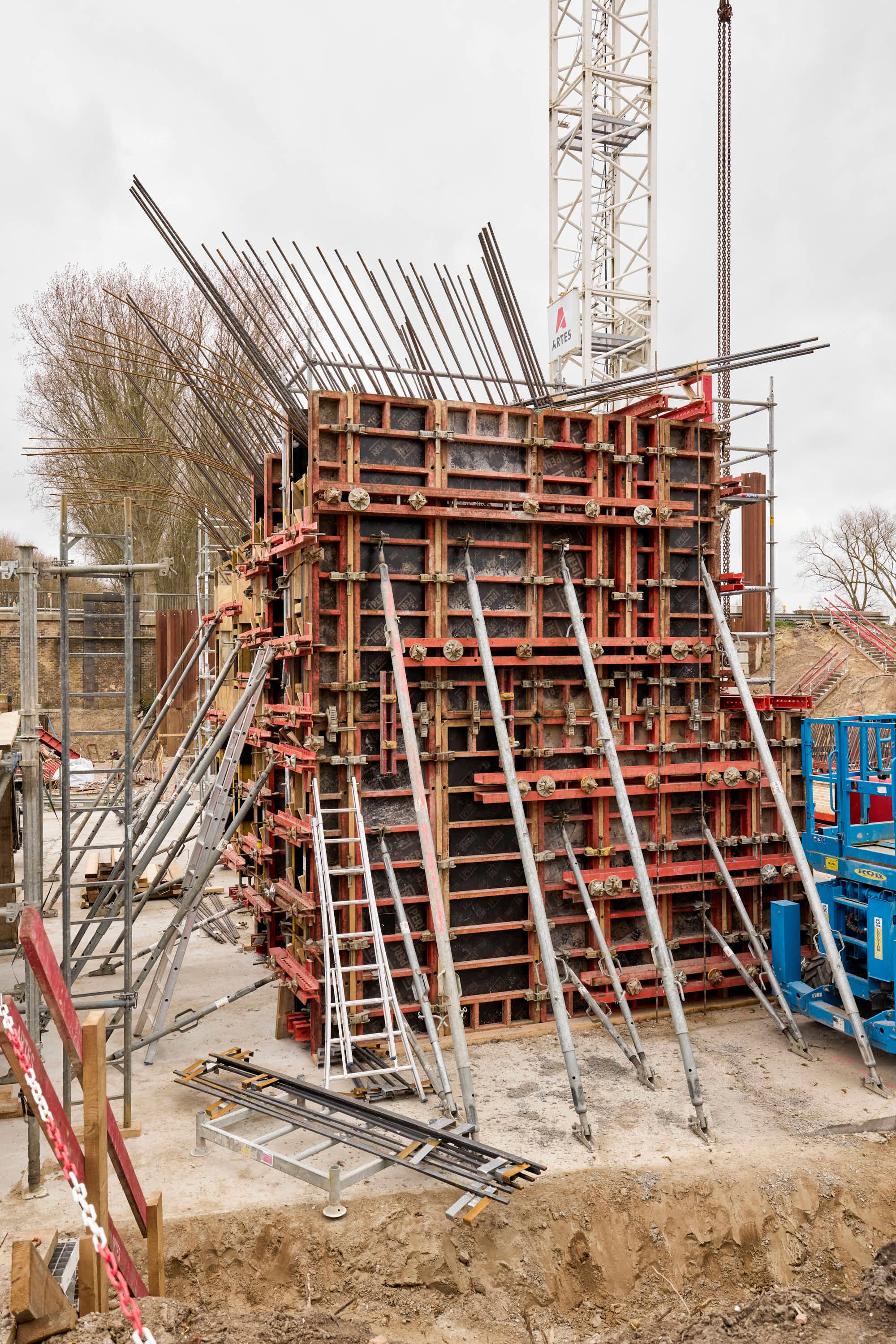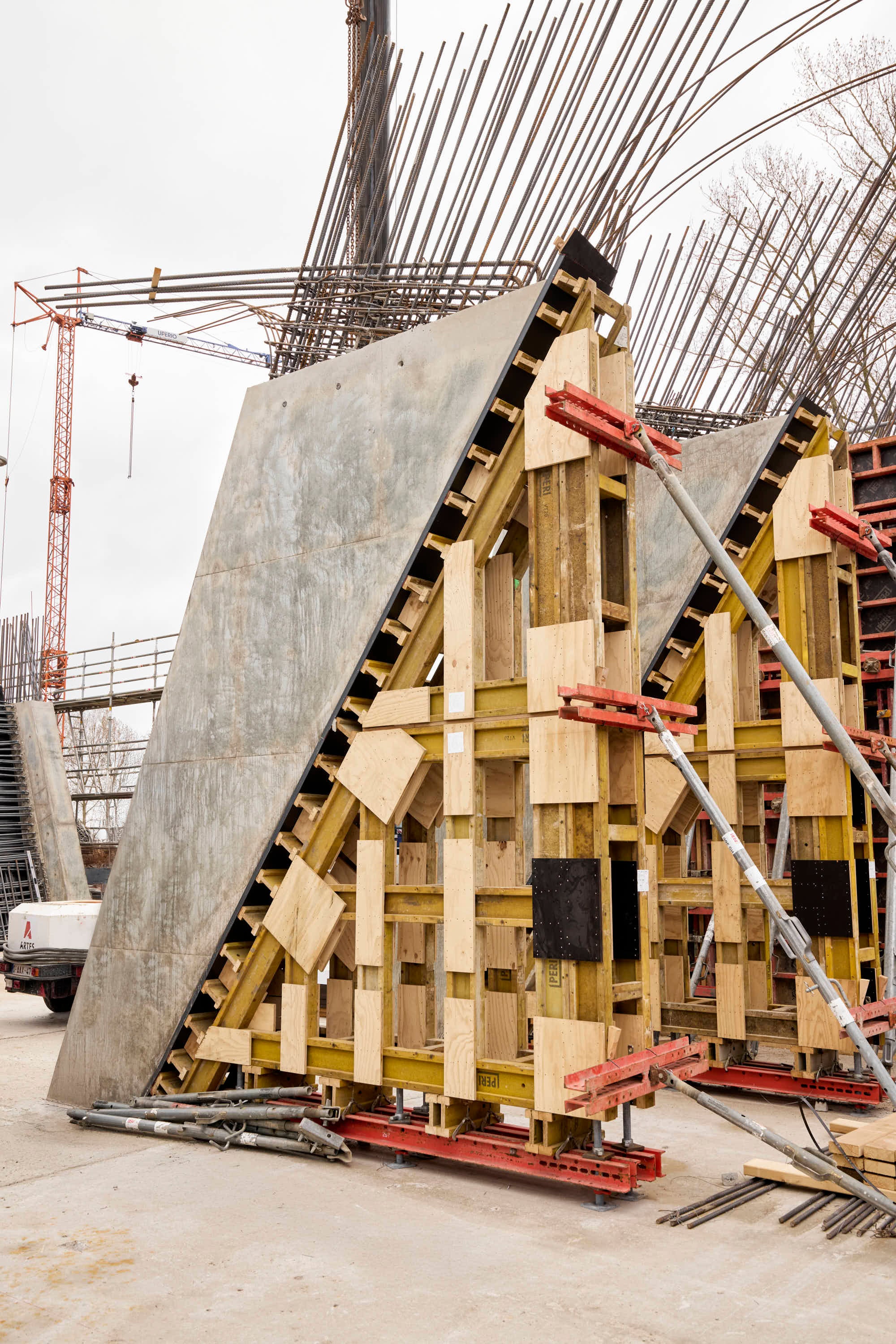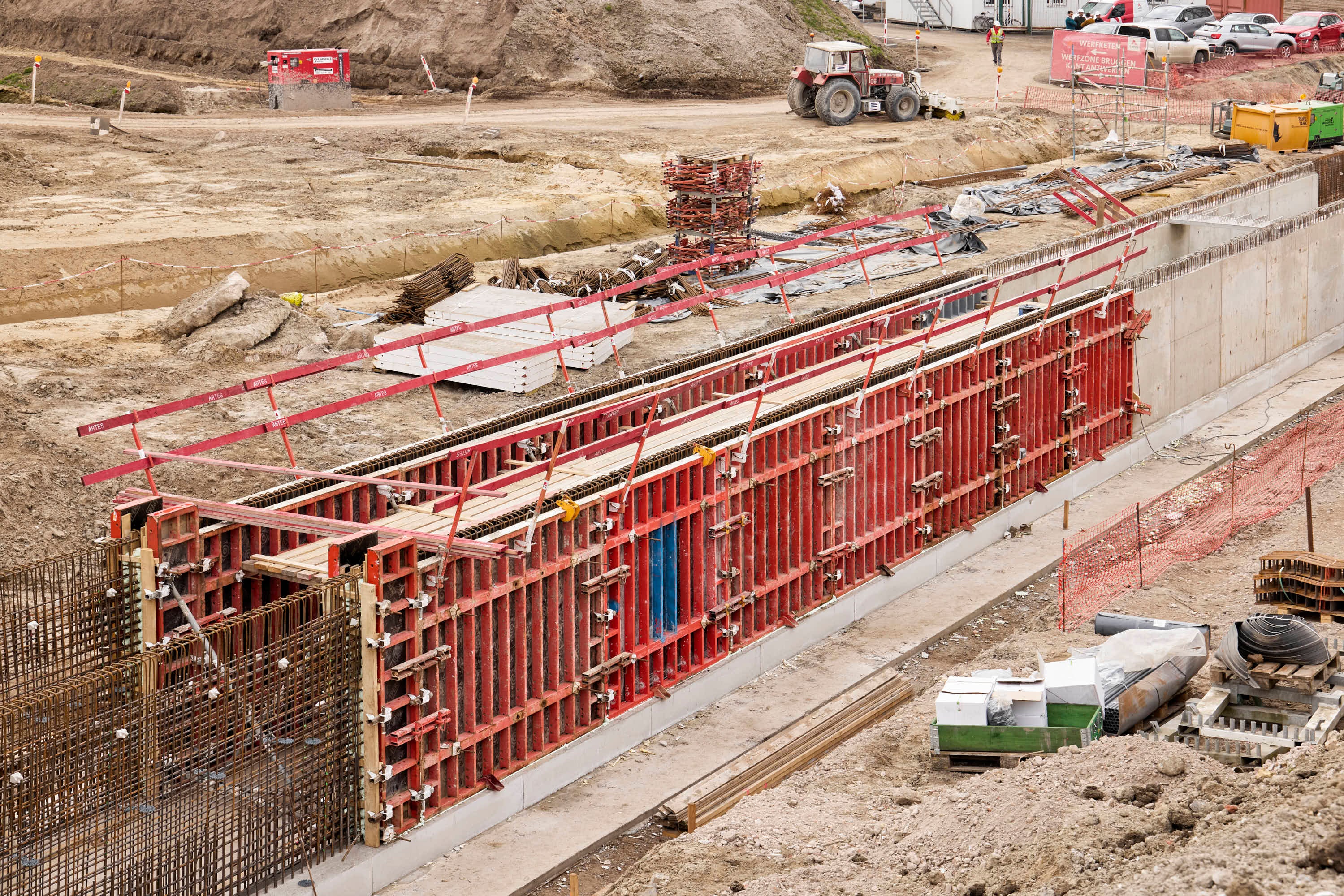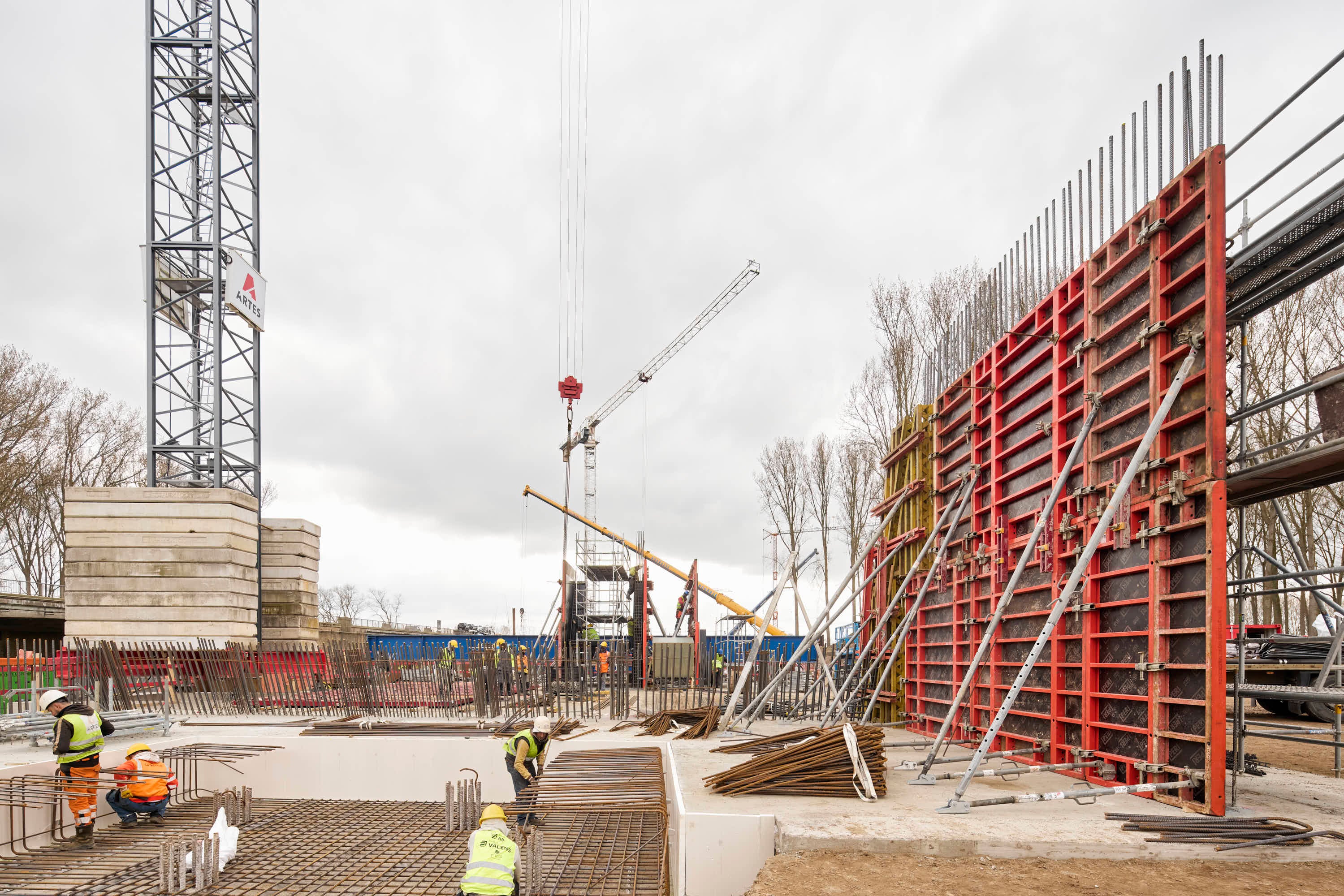 Voor het bekistingplan en de nodige materialen sloeg Artes Depret de handen in elkaar met PERI. De grote uitdading op het vlak van bekisting is ongetwijfeld de grote hoeveelheid TRIO paneelbekisting, nodig voor de randbekisting fundering, pijlers, balken en landhoofden. Daarnaast werden ook MAXIMO panelen ingezet, deze zijn compatibel met het TRIO bekistingssysteem en lieten toe het ontwerp verder te optimaliseren.