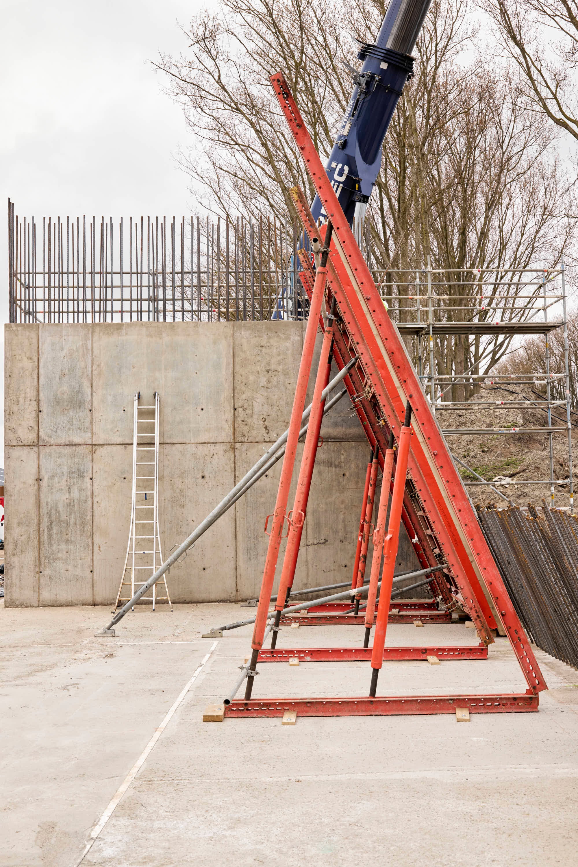 Grote hoeveelheid TRIO paneelbekistingDe grote uitdading op het vlak van bekisting is ongetwijfeld de grote hoeveelheid TRIO paneelbekisting, nodig voor de randbekisting fundering, pijlers, balken en landhoofden.