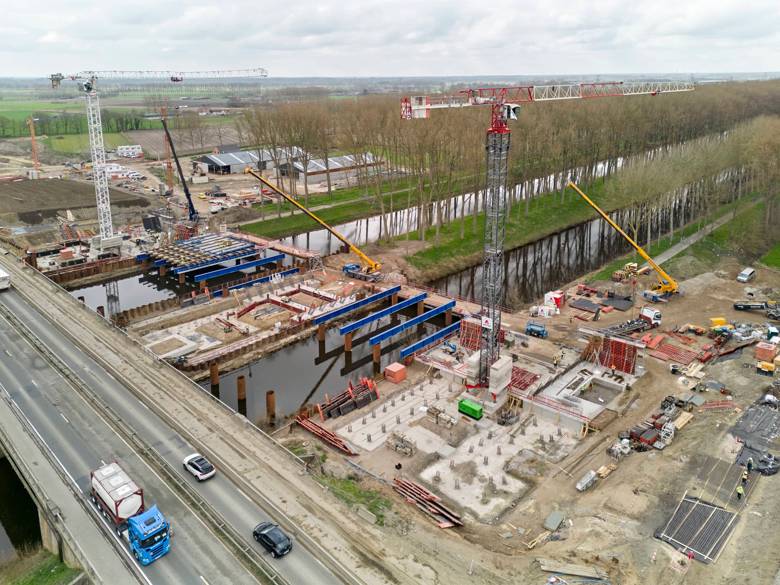 Hoofdaannemer Artes Depret ontfermt zich over de werken, in samenwerking met Agentschap Wegen en Verkeer & Willemen Groep. De funderingszolen aan beide landhoofden van de eerste brug zijn intussen gewapend en gestort en ook op het middeneiland tussen de twee kanalen wordt de funderingszool gestort. Momenteel wordt hard gewerkt aan de bekisting van de pijlers en de samenstelling van de landhoofden (bestaande uit een frontwand en twee vleugelmuren).