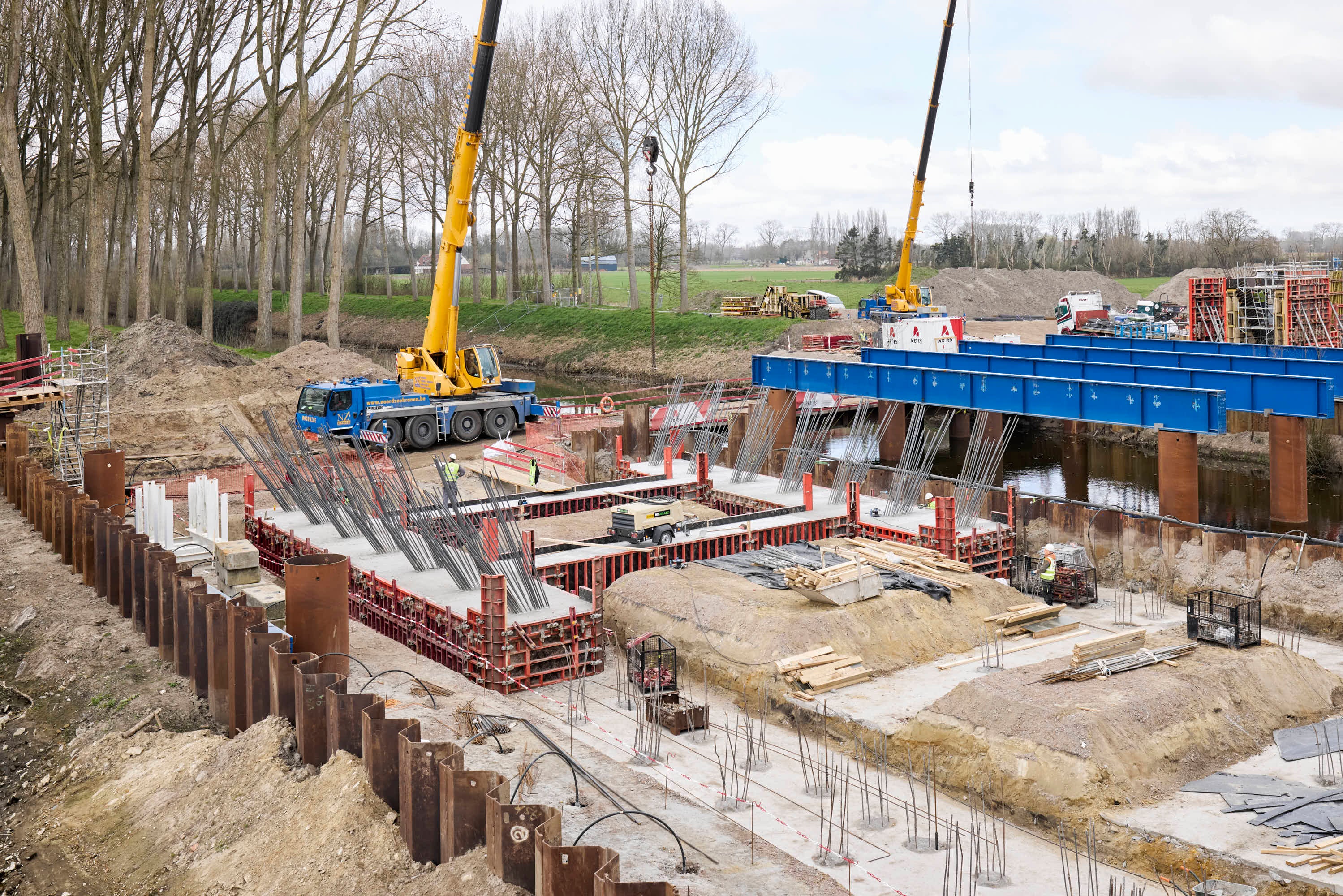 Landhoofden gestortDe funderingszolen aan beide landhoofden van de eerste brug zijn intussen gewapend en gestort.